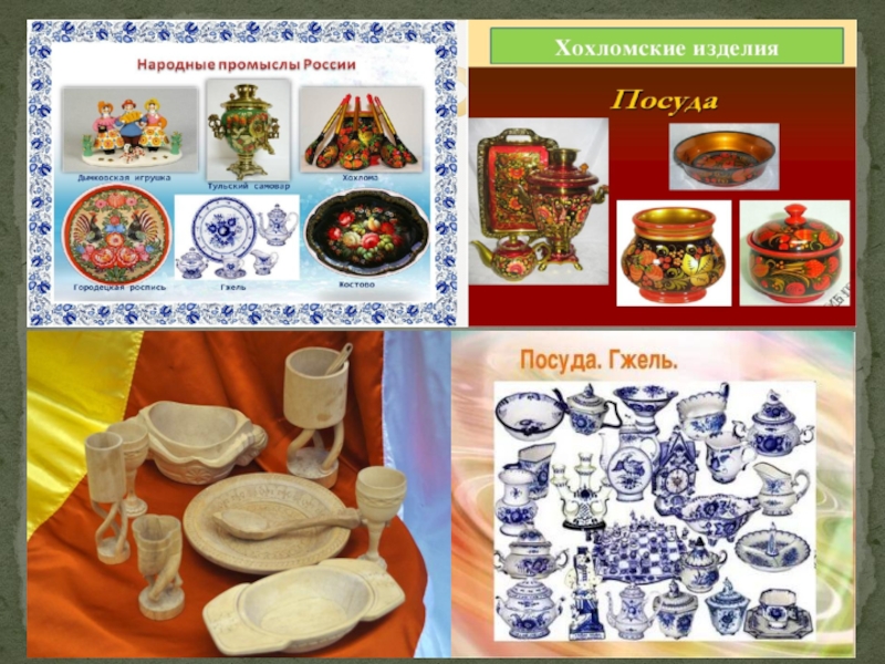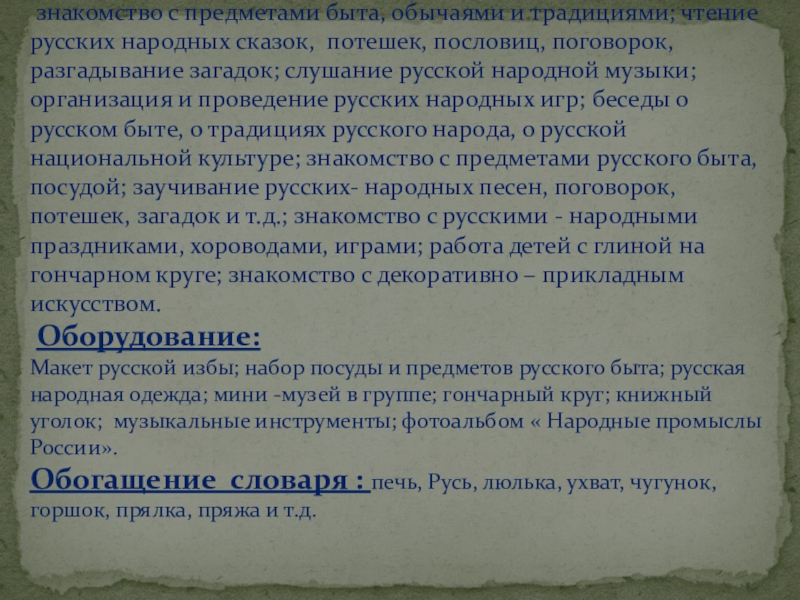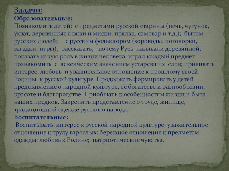 ложки и миски, прялка, самовар и т.д.); бытом русских людей; с русским фольклором (хороводы, поговорки, загадки, игры); рассказать, почему Русь называли деревянной; показать какую роль в жизни человека играл каждый предмет; познакомить с лексическим значением устаревших слов; прививать интерес, любовь и уважительное отношение к прошлому своей Родины, к русской культуре. Продолжать формировать у детей представление о народной культуре, её богатстве и разнообразии, красоте и благородстве. Приобщать к особенностям жизни и быта наших предков. Закрепить представление о труде, жилище, традиционной одежде русского народа.