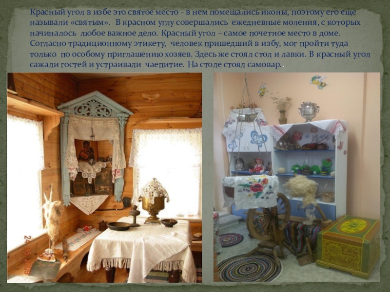 иконы, поэтому его еще называли «святым». В красном углу совершались ежедневные моления, с которых начиналось любое важное дело. Красный угол – самое почетное место в доме. Согласно традиционному этикету, человек пришедший в избу, мог пройти туда только по особому приглашению хозяев. Здесь же стоял стол и лавки. В красный угол сажали гостей и устраивали чаепитие. На столе стоял самовар..