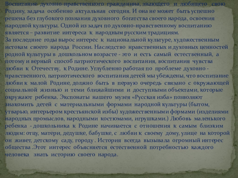 За последние годы вырос интерес к национальной культуре, художественным истокам своего народа России. Наследство нравственных и духовных ценностей родной культуры в дошкольном возрасте - это и есть самый естественный, а потому и верный способ патриотического воспитания, воспитания чувства любви к Отечеству, к Родине. Углубленно работая по проблеме духовно - нравственного, патриотического воспитания детей мы убеждены, что воспитание любви к малой Родине, должно быть в первую очередь связано с окружающей социальной жизнью и теми ближайшими и доступными объектами, которые окружают ребенка. Экспонаты нашего музея «Русская изба» позволяют знакомить детей с материальными формами народной культуры (бытом, утварью, интерьером крестьянской избы) художественными формами (изделиями народных промыслов, народными костюмами, игрушками.) Любовь маленького ребенка - дошкольника к Родине начинается с отношения к самым близким людям: отцу, матери, дедушке, бабушке, с любви к своему дому, улице на которой он живет, детскому саду, городу . История всегда вызывала огромный интерес общества .Этот интерес объясняется естественной потребностью каждого человека знать историю своего народа.