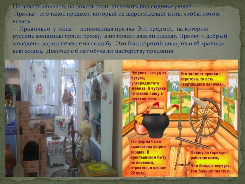 - Правильно у окна - неизменная прялка. Это предмет, на котором русские женщины пряли пряжу, а из пряжи вязали одежду. Прялку « добрый молодец» дарил невесте на свадьбу. Это был дорогой подарок и её хранили всю жизнь. Девочек с 6 лет обучали мастерству прядения.