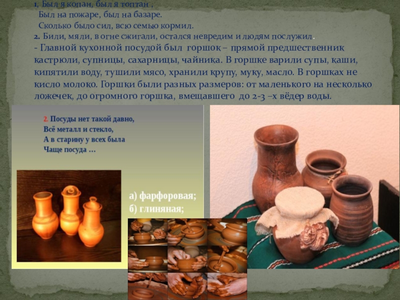- Главной кухонной посудой был горшок – прямой предшественник кастрюли, супницы, сахарницы, чайника. В горшке варили супы, каши, кипятили воду, тушили мясо, хранили крупу, муку, масло. В горшках не кисло молоко. Горшки были разных размеров: от маленького на несколько ложечек, до огромного горшка, вмещавшего до 2-3 –х вёдер воды.