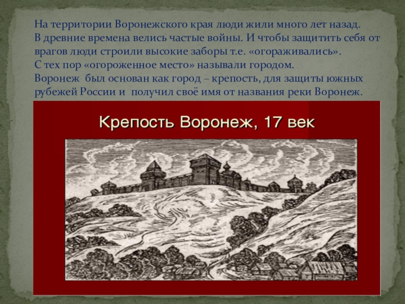 Воронеж был основан как город – крепость, для защиты южных рубежей России и получил своё имя от названия реки Воронеж.