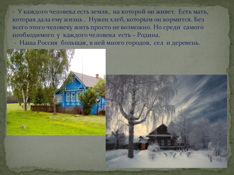 - Наша Россия большая, в ней много городов, сел и деревень.