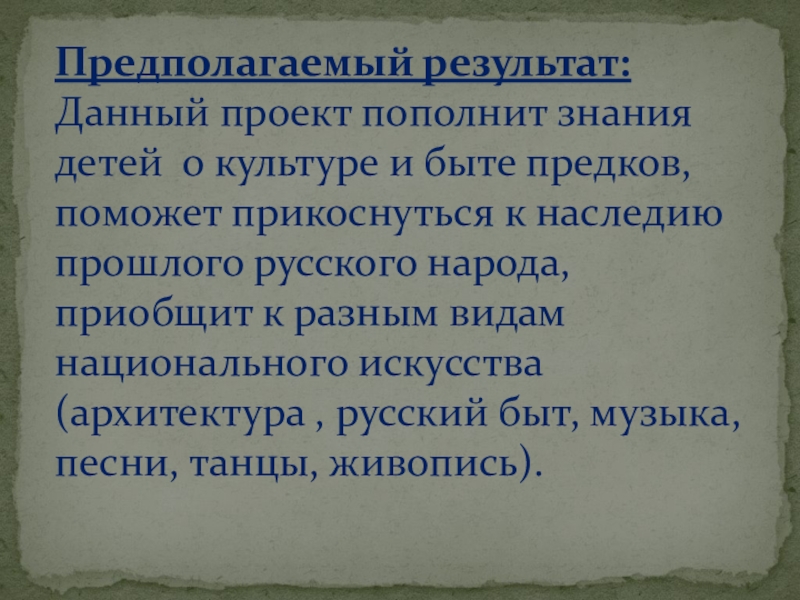 поможет прикоснуться к наследию прошлого русского народа, приобщит к разным видам национального искусства (архитектура , русский быт, музыка, песни, танцы, живопись).
