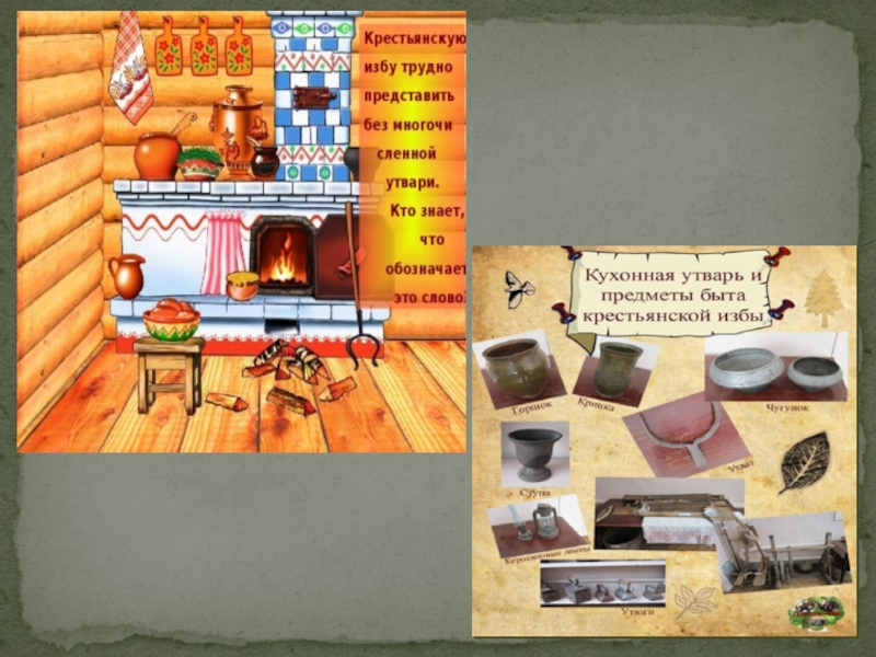 Познакомить детей: с предметами русской старины (печь, чугунок, ухват, деревянные