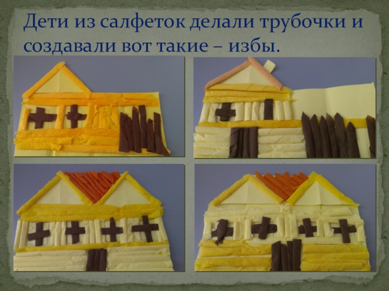 Слайд 40Дети из салфеток делали трубочки и создавали вот такие – избы.
