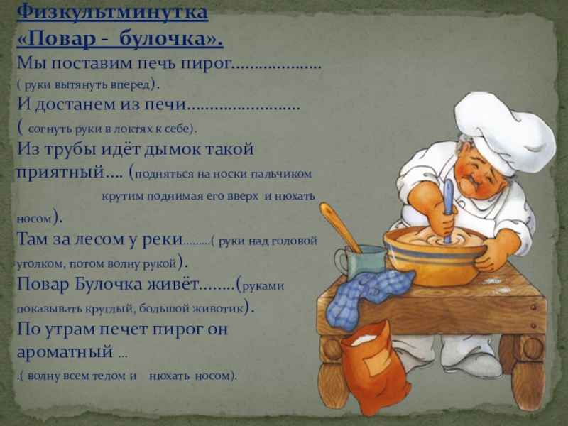 Повар Булочка живёт……..(руками показывать круглый, большой животик).