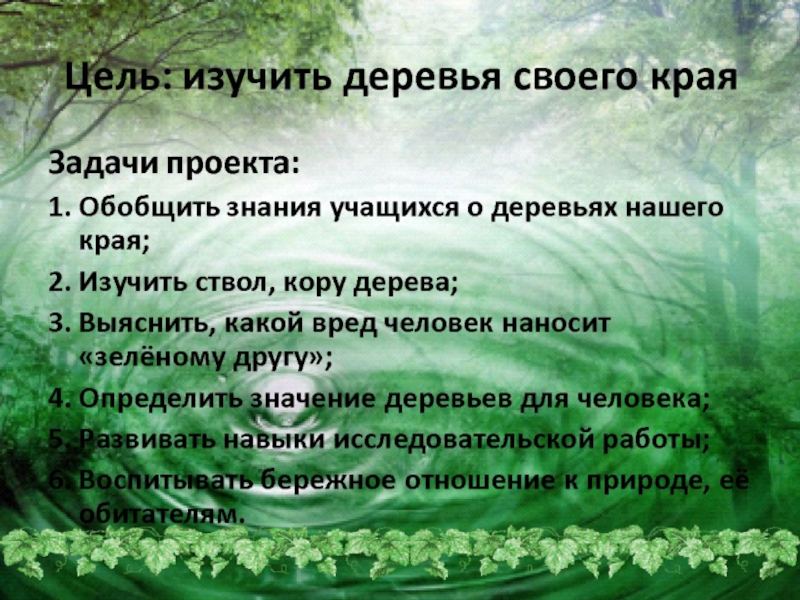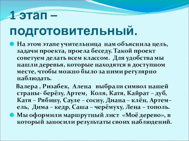 задачи проекта, проела беседу. Такой проект советуем делать всем классом. Для удобства мы нашли деревья, которые находятся в доступном месте, чтобы можно было за ними регулярно наблюдать.