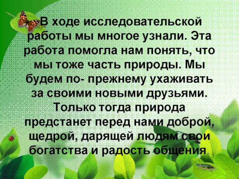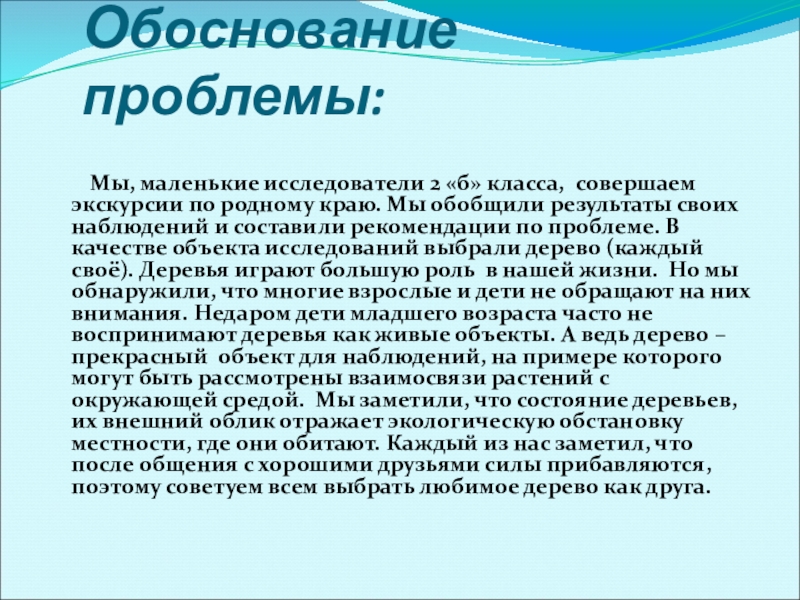 cовершаем экскурсии по родному краю. Мы обобщили результаты своих наблюдений и составили рекомендации по проблеме. В качестве объекта исследований выбрали дерево (каждый своё). Деревья играют большую роль в нашей жизни. Но мы обнаружили, что многие взрослые и дети не обращают на них внимания. Недаром дети младшего возраста часто не воспринимают деревья как живые объекты. А ведь дерево – прекрасный объект для наблюдений, на примере которого могут быть рассмотрены взаимосвязи растений с окружающей средой. Мы заметили, что состояние деревьев, их внешний облик отражает экологическую обстановку местности, где они обитают. Каждый из нас заметил, что после общения с хорошими друзьями силы прибавляются, поэтому советуем всем выбрать любимое дерево как друга.