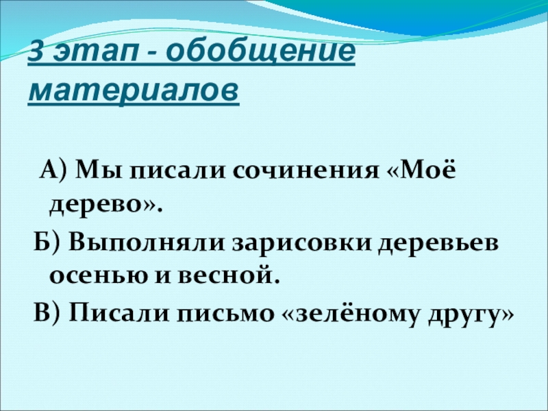 3. Обобщение материалов (сочинения, выполнение зарисовок деревьев осенью и весной, письмо «зелёному другу»).
