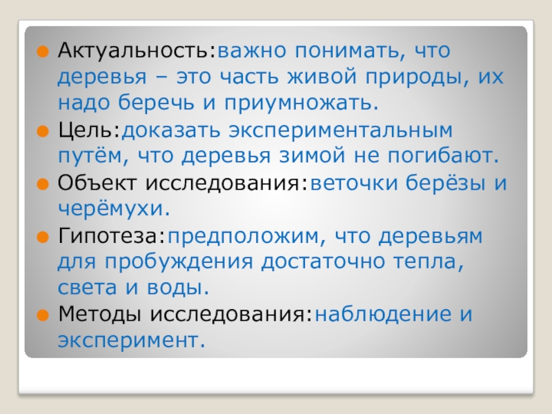 Актуальность:важно понимать, что деревья – это часть живой природы, их надо беречь и приумножать.Цель:доказать экспериментальным путём, что деревья зимой не погибают.Объект исследования:веточки берёзы и черёмухи.Гипотеза:предположим, что деревьям для пробуждения достаточно тепла, света и воды.Методы исследования:наблюдение и
