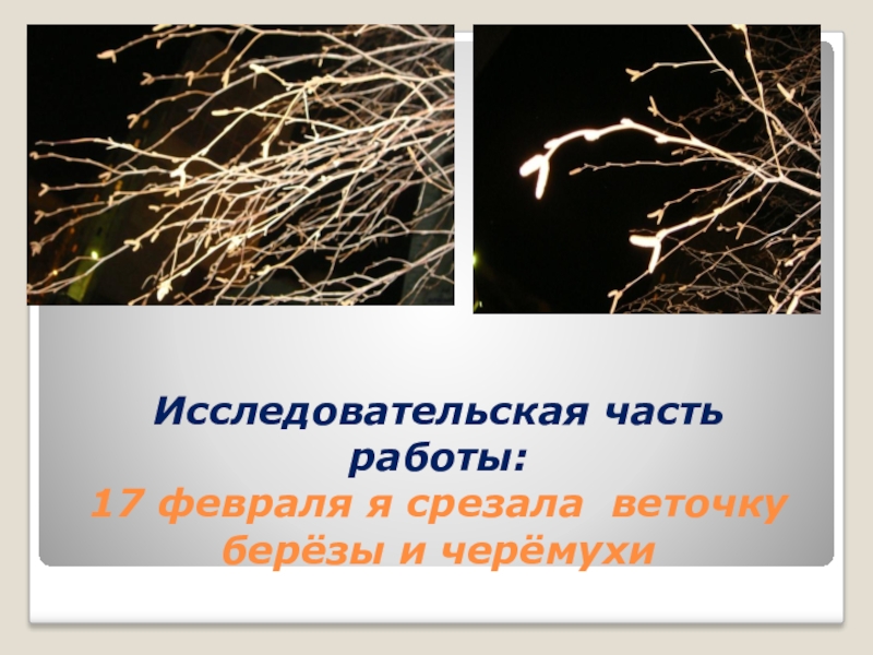 Слайд 4Исследовательская часть работы: 17 февраля я срезала веточку берёзы и черёмухи