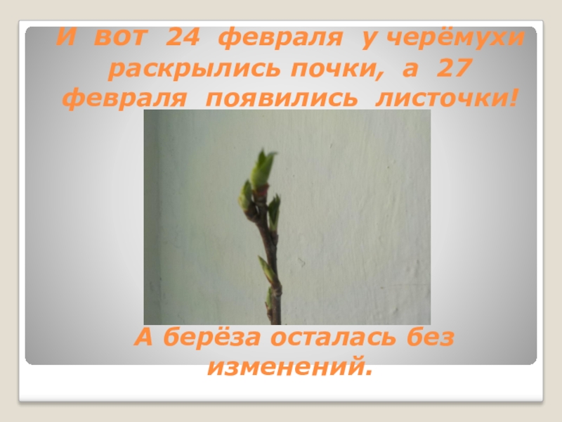 Слайд 7И вот 24 февраля у черёмухи раскрылись почки, а 27 февраля