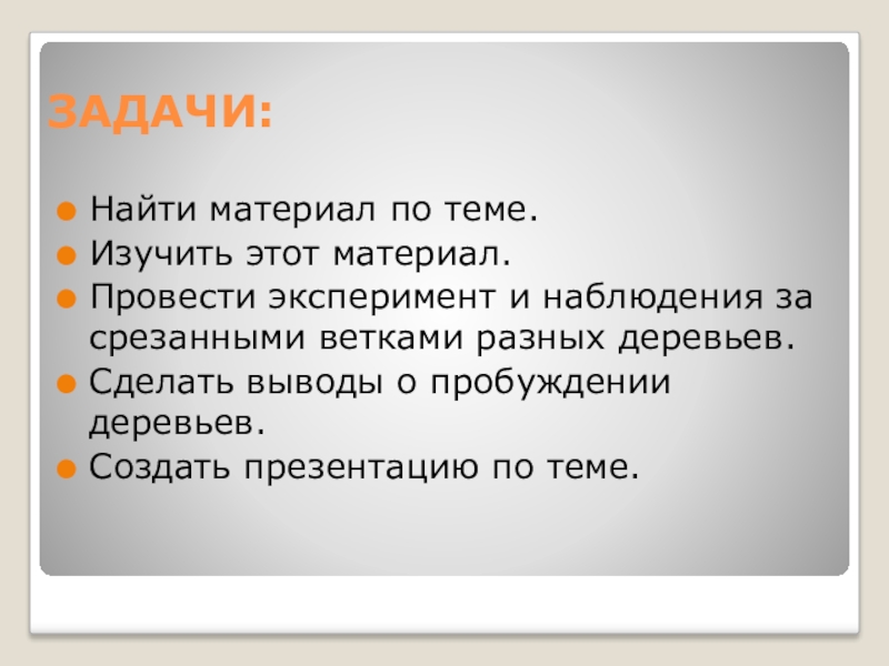 ЗАДАЧИ:Найти материал по теме.Изучить этот материал.Провести эксперимент и наблюдения за срезанными ветками разных деревьев.Сделать выводы о пробуждении