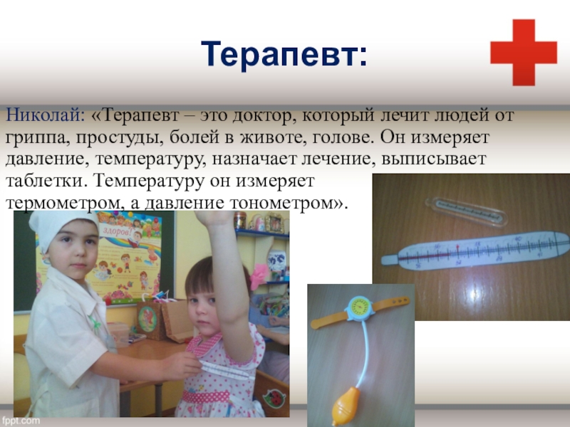 Николай: «Терапевт – это доктор, который лечит людей от гриппа, простуды, болей в животе, голове. Он измеряет