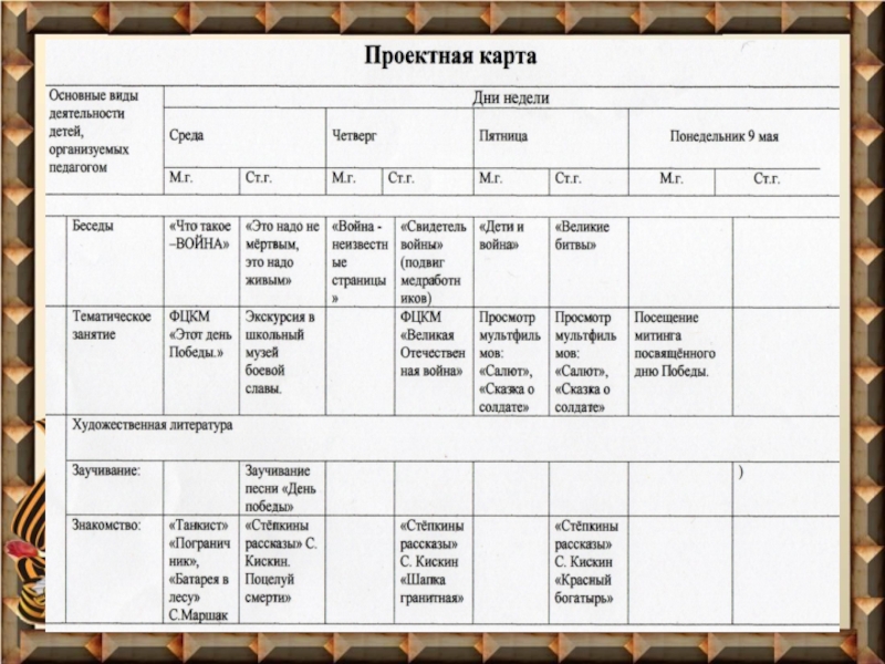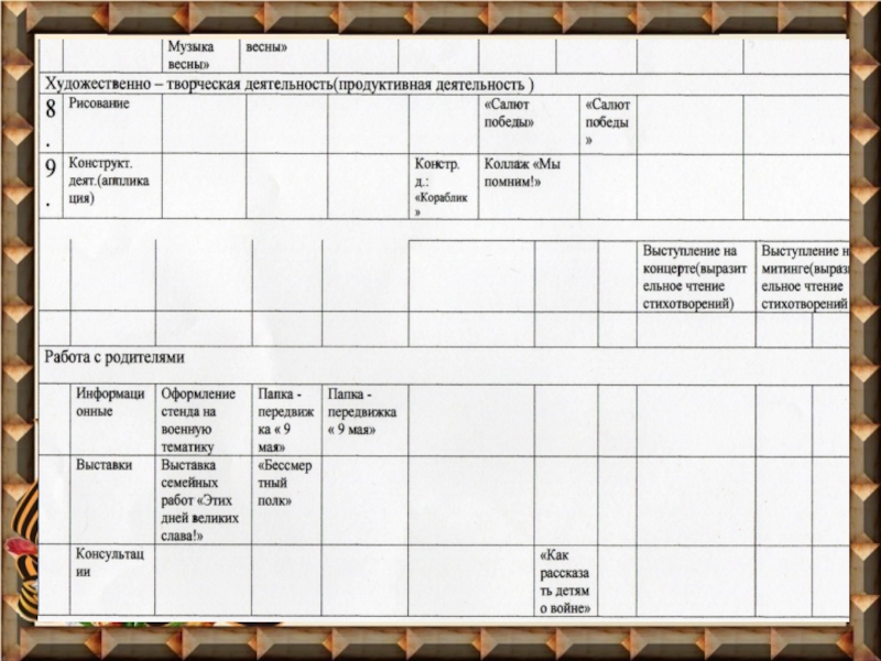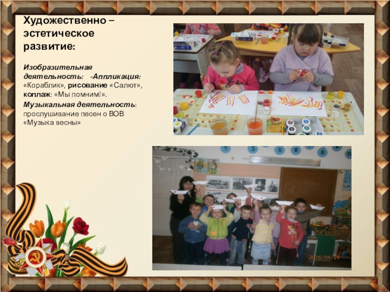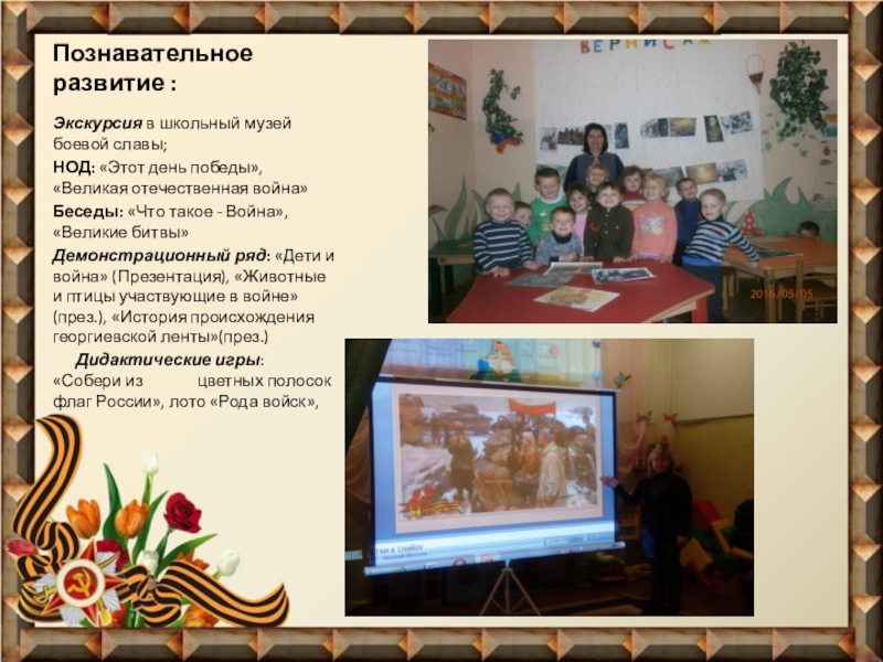 Демонстрационный ряд: «Дети и война» (Презентация), «Животные и птицы участвующие в войне»(през.), «История происхождения георгиевской ленты»(през.)