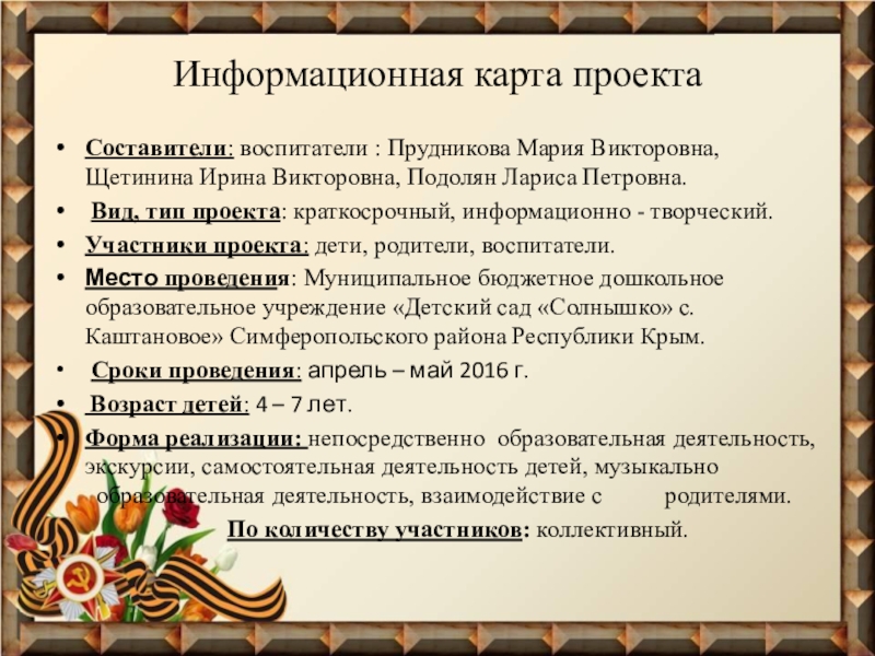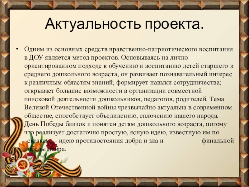 проектов. Основываясь на лично – ориентированном подходе к обучению и воспитанию детей старшего и среднего дошкольного возраста, он развивает познавательный интерес к различным областям знаний, формирует навыки сотрудничества; открывает большие возможности в организации совместной поисковой деятельности дошкольников, педагогов, родителей. Тема Великой Отечественной войны чрезвычайно актуальна в современном обществе, способствует объединению, сплочению нашего народа. День Победы близок и понятен детям дошкольного возраста, потому что реализует достаточно простую, ясную идею, известную им по сказкам, – идею противостояния добра и зла и финальной победы добра.