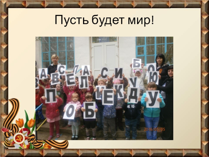 Творческий проект нашего дошкольного учреждения «Пусть будет мир!» был успешно осуществлен в период с апреля по май 2016 год . Глядя на наших ребят, можно с уверенностью сказать, что память о героях Великой Отечественной войны будет жить.