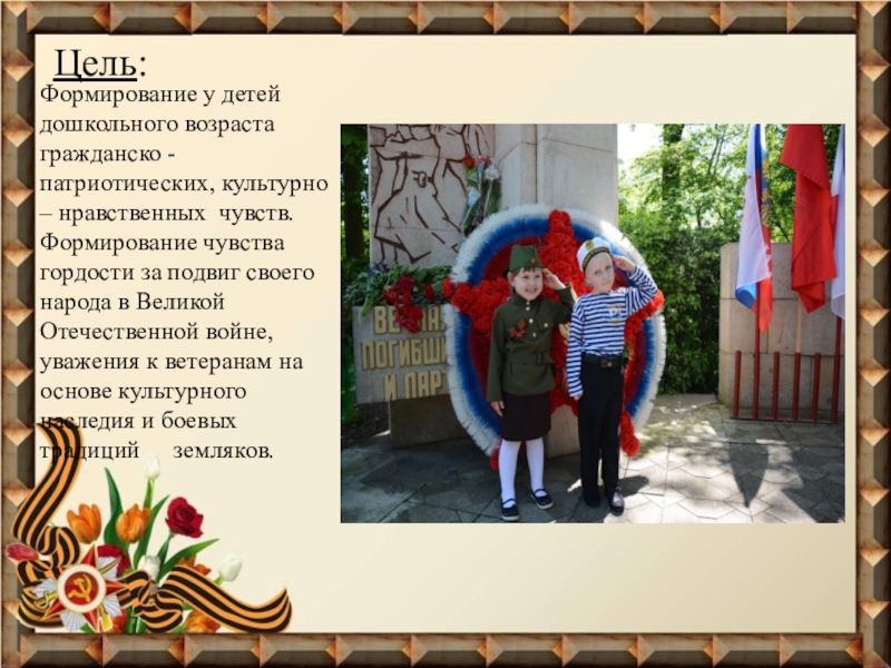 чувств. Формирование чувства гордости за подвиг своего народа в Великой Отечественной войне, уважения к ветеранам на основе культурного наследия и боевых традиций земляков.