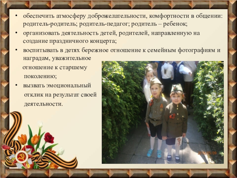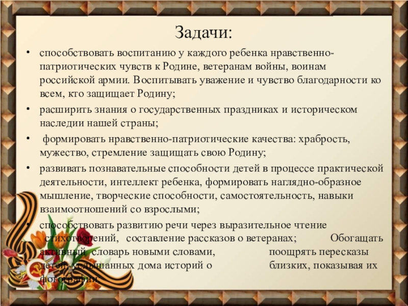 способствовать воспитанию у каждого ребенка нравственно-патриотических чувств к Родине, ветеранам войны,