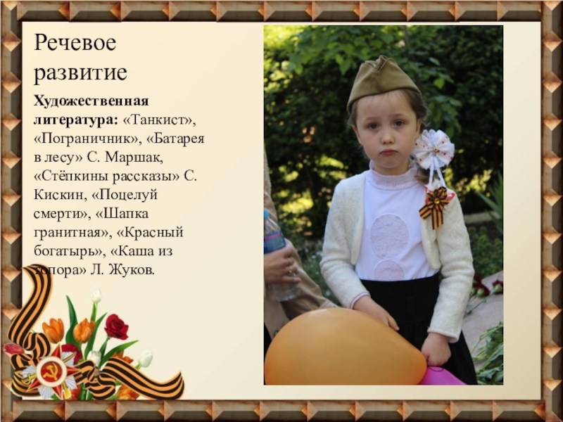 способствовать развитию речи через выразительное чтение стихотворений, составление рассказов о ветеранах; Обогащать активный словарь новыми словами, поощрять пересказы детей, услышанных дома историй о близких, показывая их фотографии;