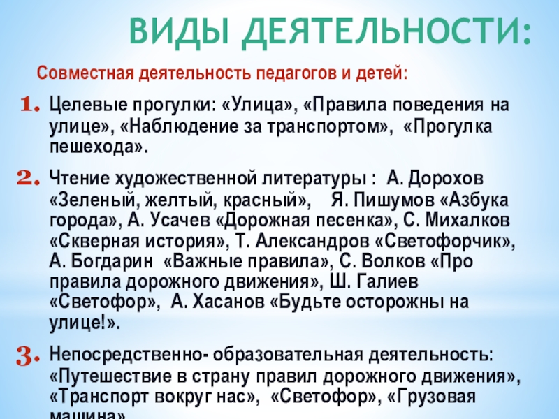 Чтение художественной литературы : А. Дорохов «Зеленый, желтый, красный», Я. Пишумов «Азбука города», А. Усачев «Дорожная песенка», С. Михалков «Скверная история», Т. Александров «Светофорчик», А. Богдарин «Важные правила», С. Волков «Про правила дорожного движения», Ш. Галиев «Светофор», А. Хасанов «Будьте осторожны на улице!».
