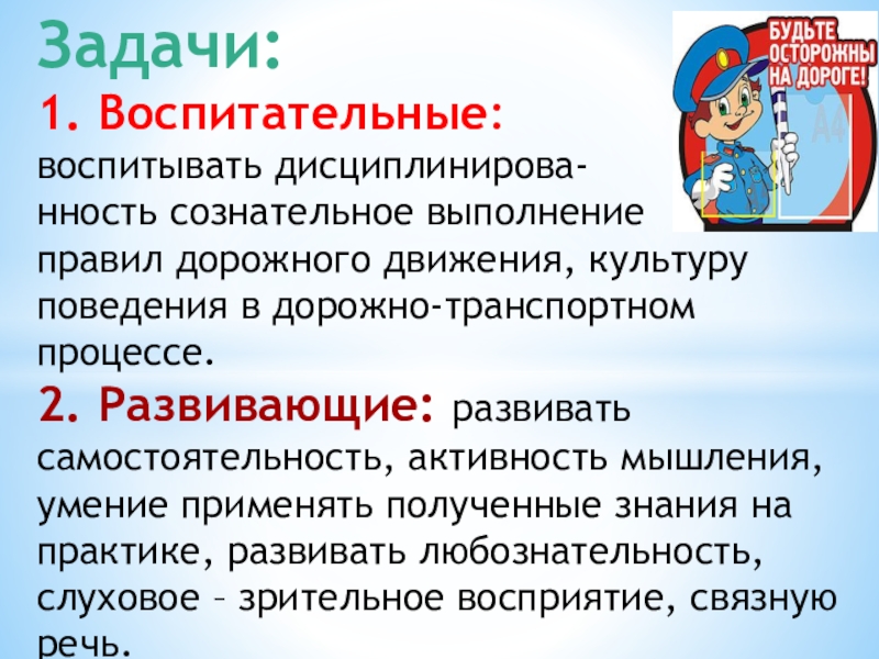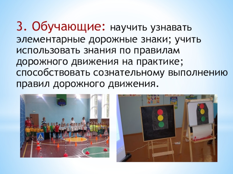 правилам дорожного движения на практике; способствовать сознательному выполнению правил дорожного движения.