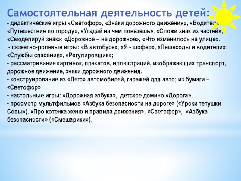 - сюжетно-ролевые игры: «В автобусе», «Я - шофер», «Пешеходы и водители»; «Службы спасения», «Регулировщик»;