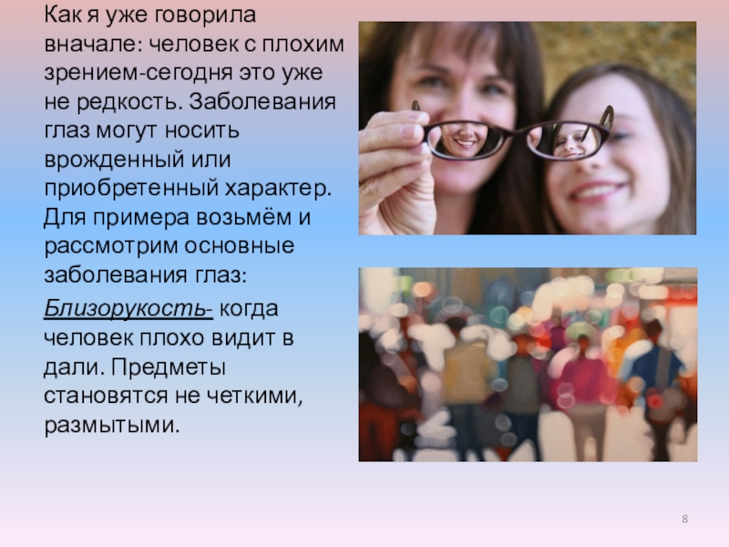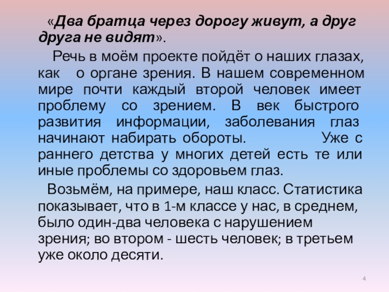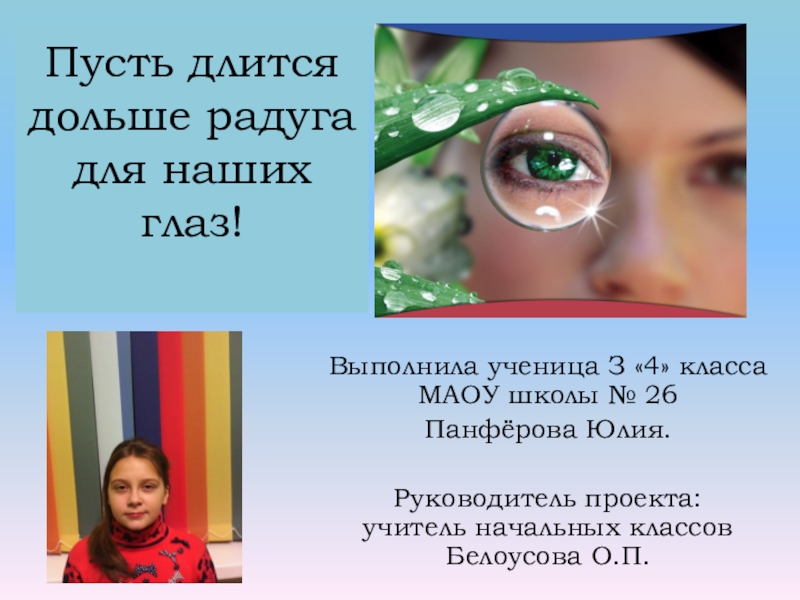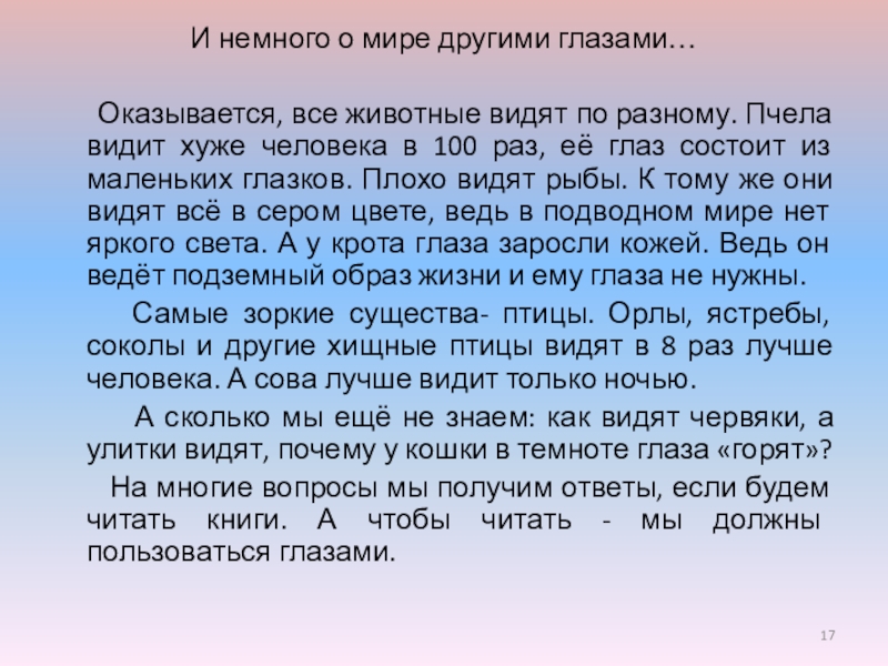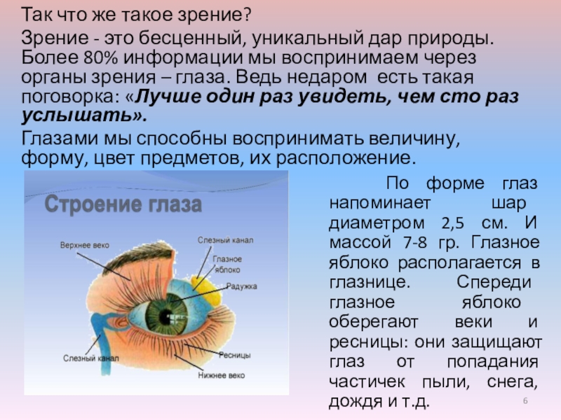 По форме глаз напоминает шар диаметром 2,5 см. И массой 7-8 гр. Глазное яблоко располагается в глазнице. Спереди глазное яблоко оберегают веки и ресницы: они защищают глаз от попадания частичек пыли, снега, дождя и т.д.