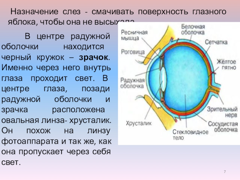 В центре радужной оболочки находится черный кружок – зрачок. Именно через него внутрь глаза проходит свет. В центре глаза, позади радужной оболочки и зрачка расположена овальная линза- хрусталик. Он похож на линзу фотоаппарата и так же, как она пропускает через себя свет.