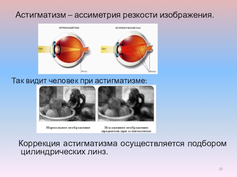 Коррекция астигматизма осуществляется подбором цилиндрических линз.