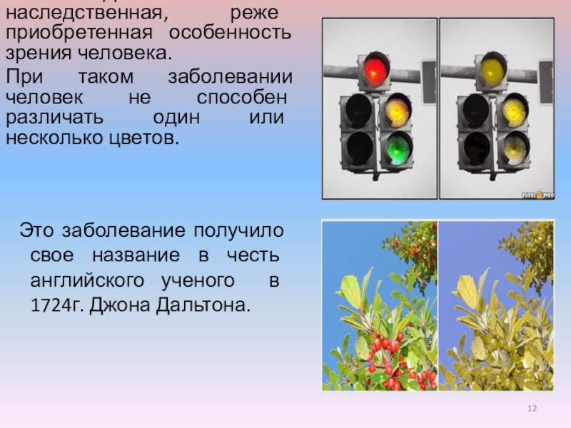 Это заболевание получило свое название в честь английского ученого в 1724г. Джона Дальтона.