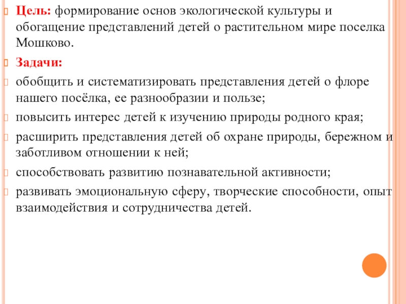 обобщить и систематизировать представления детей о флоре нашего посёлка, ее разнообразии и пользе;