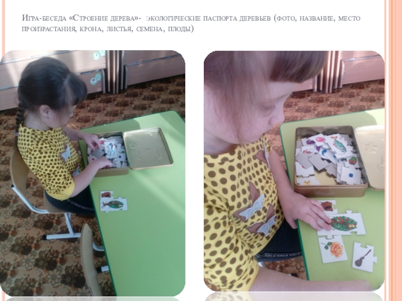 Слайд 11Игра-беседа «Строение дерева»- экологические паспорта деревьев (фото, название, место произрастания, крона,