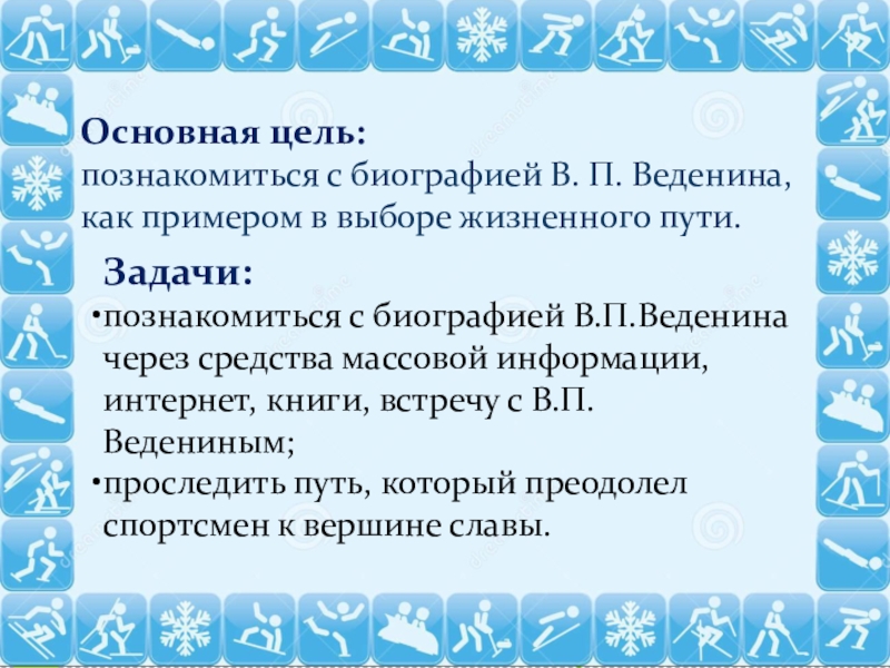 познакомиться с биографией В.П.Веденина через средства массовой информации, интернет, книги, встречу с В.П. Ведениным;