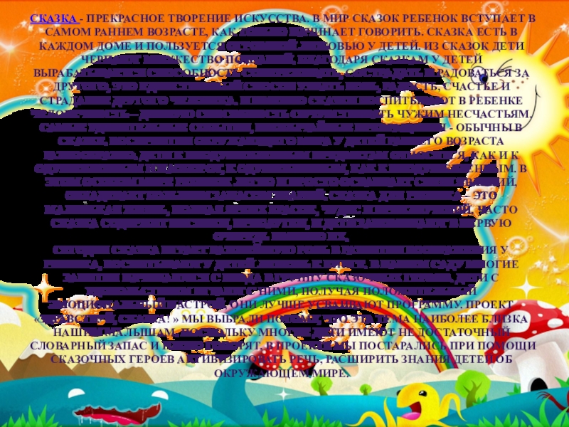 Слайд 2Сказка - прекрасное творение искусства. В мир сказок ребенок вступает в самом