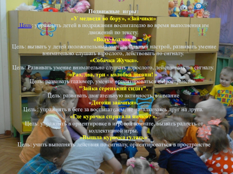 Цель: упражнять в ориентировке в игровой комнате, вызвать радость от коллективной игры.