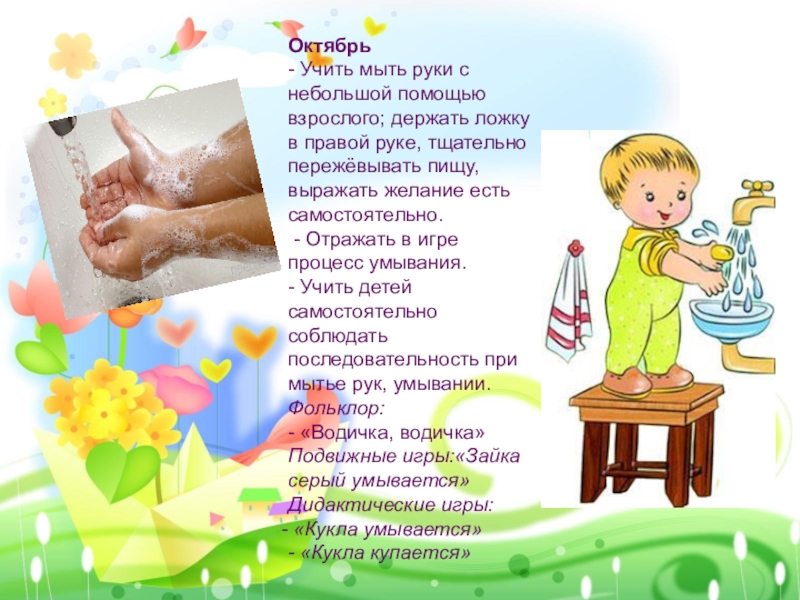 - Учить мыть руки с небольшой помощью взрослого; держать ложку в