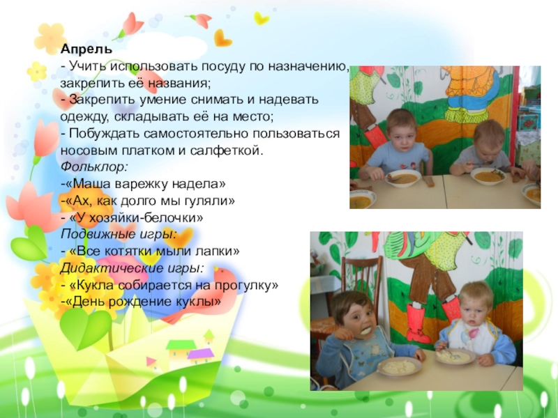 - Учить пользоваться салфеткой, узнавать и называть некоторые блюда;