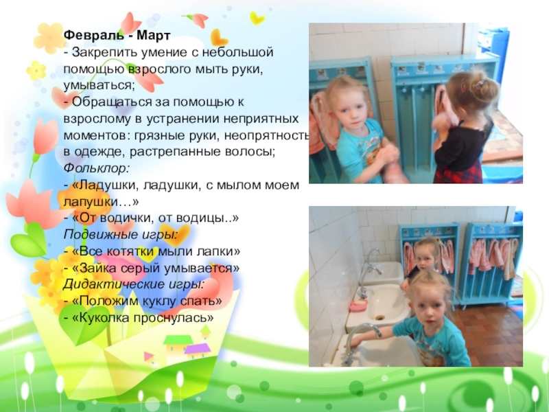 - Закрепить умение с небольшой помощью взрослого мыть руки,