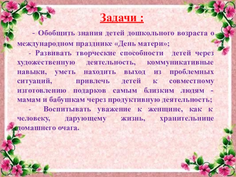 - Развивать творческие способности детей через художественную деятельность, коммуникативные навыки, уметь находить выход из проблемных ситуаций, привлечь детей к совместному изготовлению подарков самым близким людям - мамам и бабушкам через продуктивную деятельность;