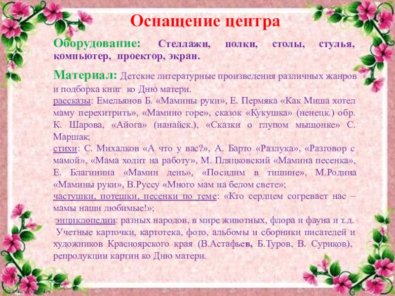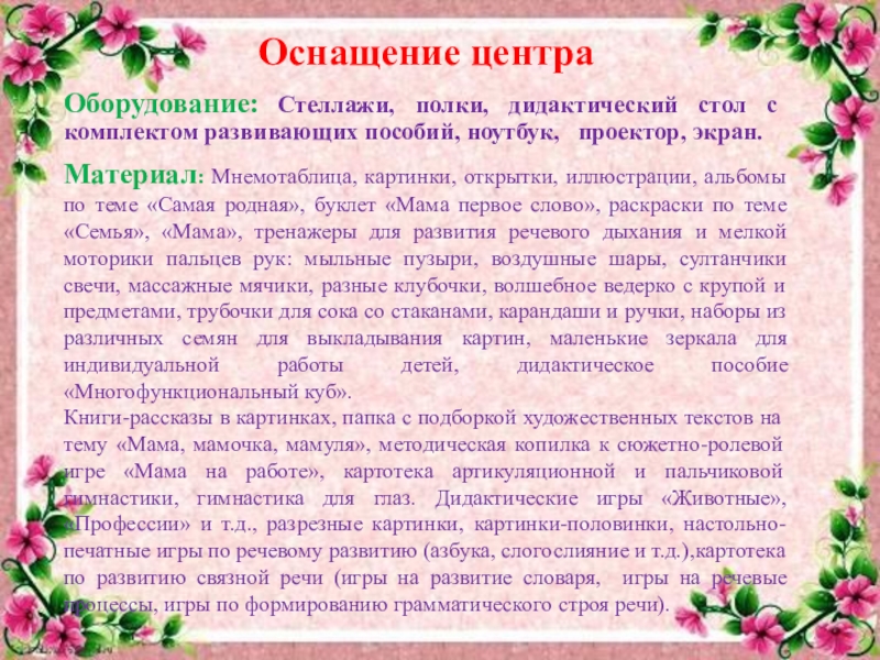Слайд 1«Проект развивающей предметно-пространственной среды по теме «День матери».