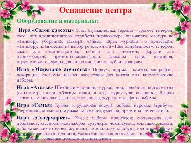 Игра «Супермаркет» Касса; наборы продуктов; спецодежда для продавцов, кассиров, менеджеров; сувениры; чеки, сумки, кошельки, деньги; наборы мелких игрушек; журналы, газеты; одежда, обувь, головные уборы и др.; учетные книги, ценники, указатели, названия отделов; телефоны, рации, микрофоны; упаковка, тележки для продуктов.