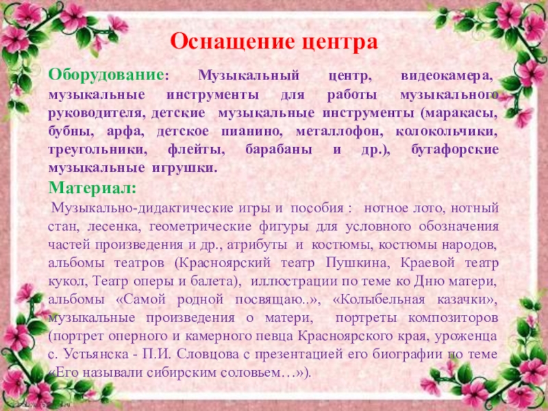 Музыкально-дидактические игры и пособия : нотное лото, нотный стан, лесенка, геометрические фигуры для условного обозначения частей произведения и др., атрибуты и костюмы, костюмы народов, альбомы театров (Красноярский театр Пушкина, Краевой театр кукол, Театр оперы и балета), иллюстрации по теме ко Дню матери, альбомы «Самой родной посвящаю..», «Колыбельная казачки», музыкальные произведения о матери, портреты композиторов (портрет оперного и камерного певца Красноярского края, уроженца с. Устьянска - П.И. Словцова с презентацией его биографии по теме «Его называли сибирским соловьем…»).