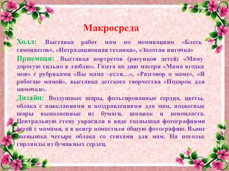 Дизайн: Воздушные шары, фольгированные сердца, цветы, облака с пожеланиями и поздравлениями для мам, подвесные шары выполненные из бумаги, шпажек и пенопласта. Центральную стену украсили в виде солнышка фотографиями детей с мамами, а в центр поместили общую фотографию. Выше солнышка четыре облака со стихами для мам. На потолке гирлянды из бумажных сердец.