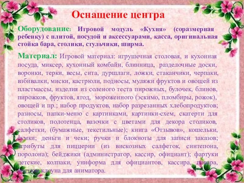 Материал: Игровой материал: игрушечная столовая, и кухонная посуда, миксер, кухонный комбайн, блинница, разделочные доски, воронки, терки, весы, сита, дуршлаги, ложки, стаканчики, черпаки, взбивалки, миски, кастрюли, подносы, муляжи фруктов и овощей из пластмассы, изделия из соленого теста пирожных, булочек, блинов, пирожков, фруктов, ягод, мороженного (эскимо, пломбиры, рожок), овощей и пр.; набор продуктов, набор разрезанных хлебопродуктов; разносы, папки-меню с картинками, картинки-схем, скатерти для столиков, полотенца, вазочки с цветами для декора столиков, салфетки, (бумажные, текстильные); книга «Отзывов», кошельки, сумки; деньги и чеки; ручки и блокноты для записи заказов; атрибуты для пиццерии (из вискозных салфеток, синтепона, поролона); бейджики (администратор, кассир, официант); фартуки детские, колпаки, униформа для официантов, кассира, повара, костюм клоуна для аниматора.