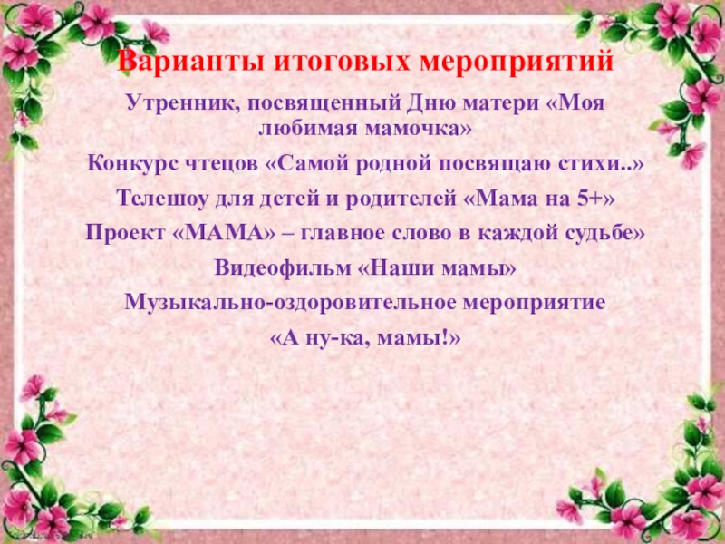 Слайд 29Варианты итоговых мероприятий