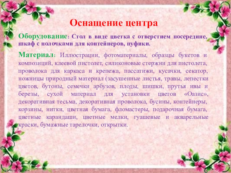 Материал: Иллюстрации, фотоматериалы, образцы букетов и композиций, клеевой пистолет, силиконовые стержни для пистолета, проволока для каркаса и крепежа, пассатижи, кусачки, секатор, ножницы природный материал (засушенные листья, травы, лепестки цветов, бутоны, семечки арбузов, плоды, шишки, прутья ивы и березы, сухой материал для установки цветов «Оазис», декоративная тесьма, декоративная проволока, бусины, контейнеры, корзины, нитки, цветная бумага, фломастеры, подарочная бумага, цветные карандаши, цветные мелки, гуашевые и акварельные краски, бумажные тарелочки, открытки.