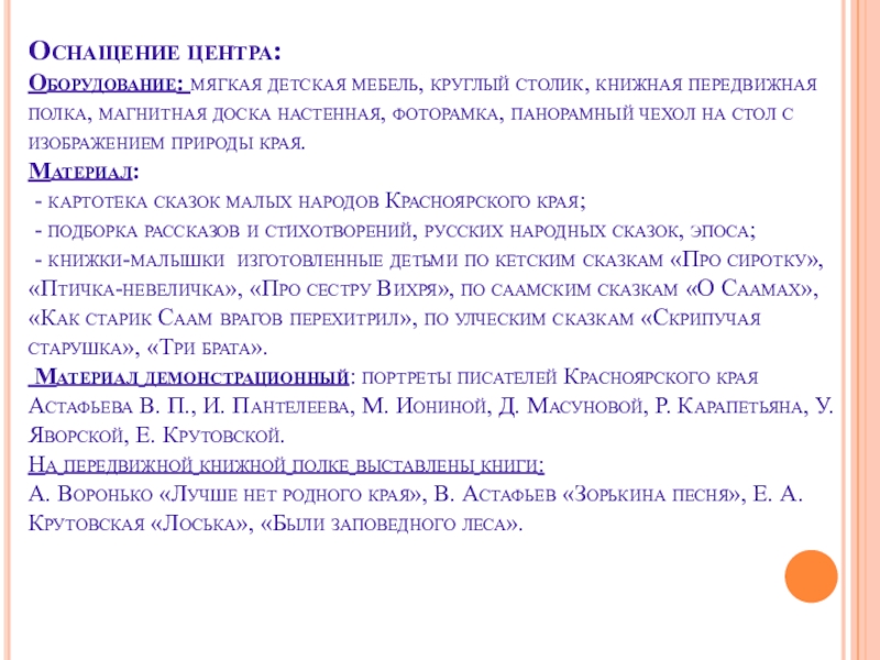 Материал демонстрационный: портреты писателей Красноярского края Астафьева В. П., И. Пантелеева, М. Иониной, Д. Масуновой, Р. Карапетьяна, У. Яворской, Е. Крутовской.