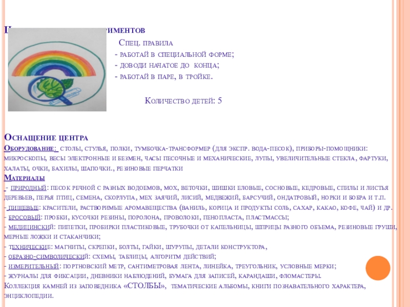 Оборудование: столы, стулья, полки, тумбочка-трансформер (для экспр. вода-песок), приборы-помощники: микроскопы, весы электронные и безмен, часы песочные и механические, лупы, увеличительные стекла, фартуки, халаты, очки, бахилы, шапочки., резиновые перчатки